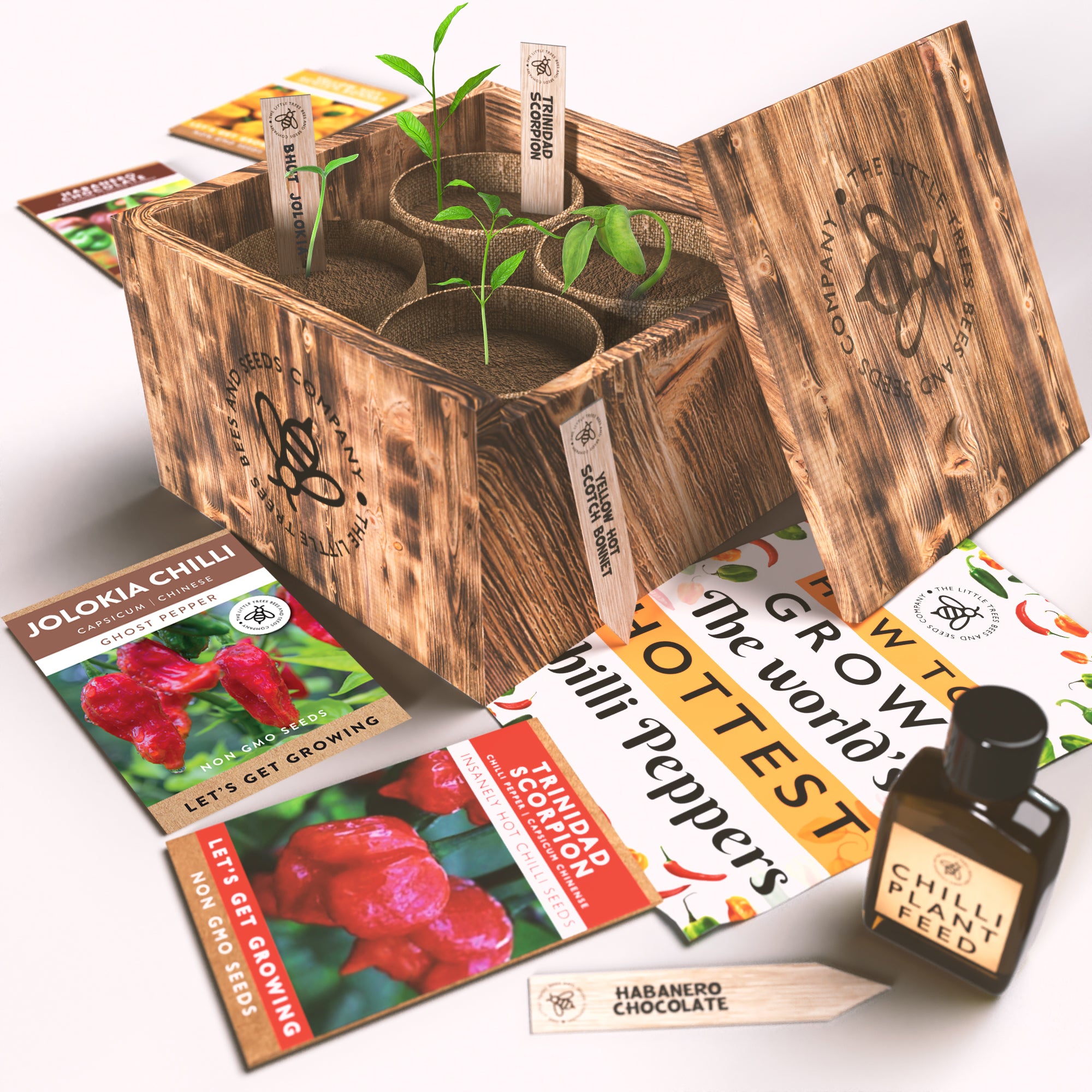 This beautiful gift set includes four super-hot varieties of chilli seeds, growing pots, chilli compost, chilli fertiliser, plant markers, chilli growing guide with recipes and comes in our bespoke wooden box with a sliding lid.  There is even a tray in the box so the chillies can be grown inside the box, then potted on and the box used for storage at home or in the shed.
