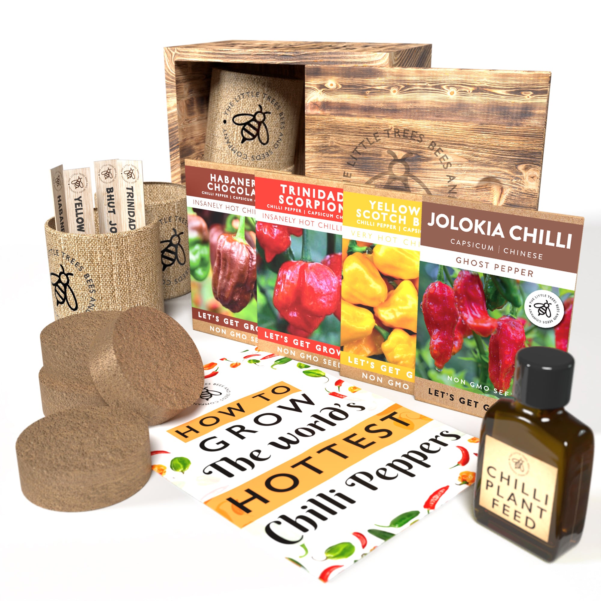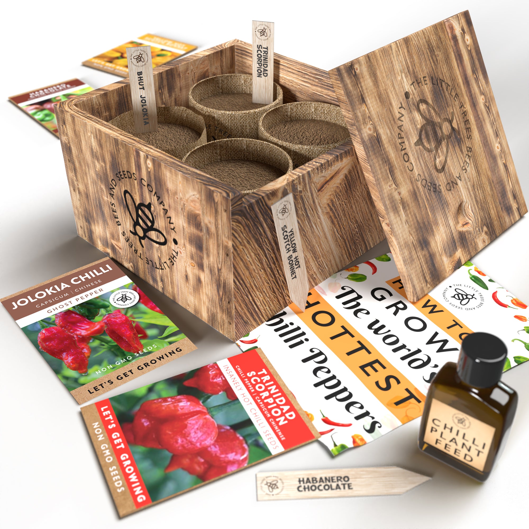 • This indoor garden kit includes: Four varieties of the worlds hottest chilli seeds, four fabric grow bags, four expanding coco coir potting soil disks for planting your seeds, four wooden plant markers, chilli plant feed, our very own seed growing guide including recipe section and a real wood gift box planter with drip tray.